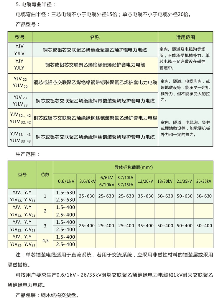 二、使用范圍 本產品適用于配電網(wǎng)、工業(yè)裝置等領域,用于固定敷設在交流50HZ、額定電壓0.6/1kv的電力輸配電線路上,主要功能是輸送電能。本產品為通常條件下使用的產品,不適用一些特殊條件的場合,如架空、水下、船底、海底、核電站等。
